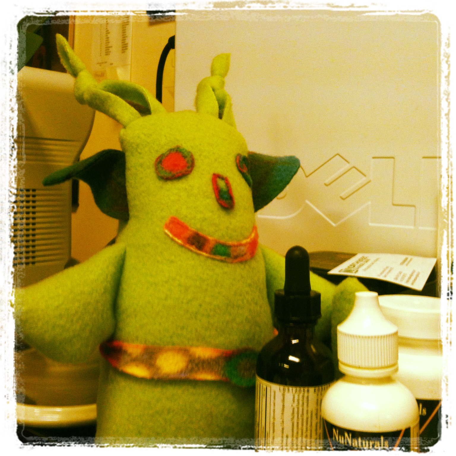 The photo above is the WEE BEASTIE I purchased at a local vendor show a few years ago! It still sits in the same place! On my desk at work! It makes me smile often! I LOVE the lil guy! He has LOTS of personality! I have him on a file fold tray ledge where he can sit. As you can see he guards my computer tower - as well as my NuNaturals items and some of my Tea.